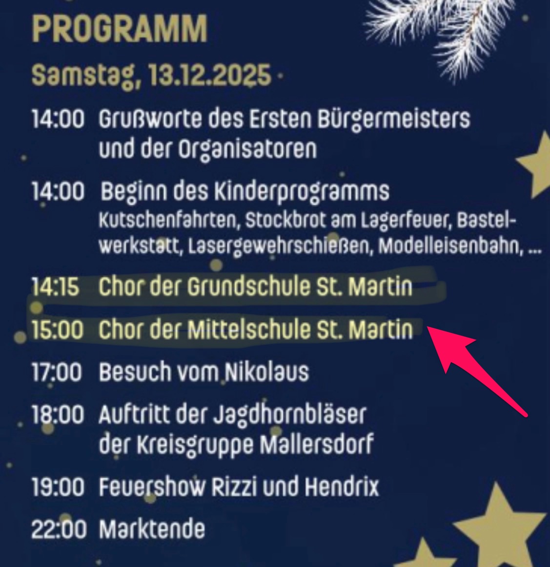 Die Chöre der Sankt Martin Grund- und Mittelschule bereiten sich momentan intensiv auf ihre großen Auftritte am Christkindlmarkt der Marktgemeinde Mallersdorf-Pfaffenberg, der am 13.12.2025 beim HDG stattfindet, vor.