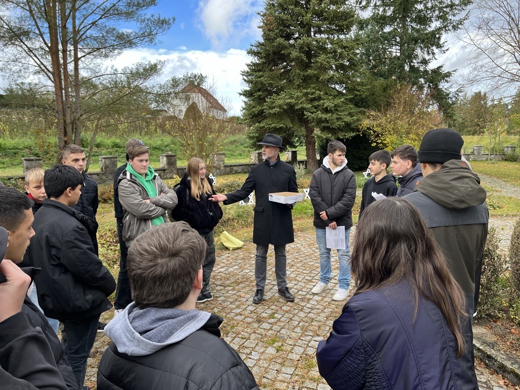 Mit unserem Besuch gedenken wir auch den schrecklichen Geschehnissen der Reichskristallnacht vom 9./10. November 1938. Gerade in der heutigen Zeit, in der antisemitische Straftaten leider wieder zunehmen, war es uns ein großes Anliegen den Jüdischen Friedhof vor Ort zu besuchen und ein Zeichen gegen Antisemitismus zu setzen. Nach Begrüßungsworten durch Herrn Zuchs, erinnern sieben Schüler mit kleinen Texten an die Ereignisse im April 1945 und an die Rettung der 13 jüdischen Häftlinge, dank der Hilfe mutiger Bürger aus unserer Gemeinde. Natürlich gedenken wir an diesem Ort auch den 67 Opfern, die diese Zeit nicht überlebt haben. Die 67 Davidssterne symbolisieren dies. Im Anschluss legten die Schüler ihre selbst gestalteten Steine an der Gedenkstätte nieder. Gemeinsam stimmten wir das Lied „Shalom Chaverim“ an (= Frieden, Freunde). Herr Zuchs unterstützte uns stimmkräftig und begleitete uns mit seiner Gitarre. Nun hatten die Schüler noch Gelegenheit, den virtuellen Rundgang (QR-Codes) selbstständig zu durchlaufen.